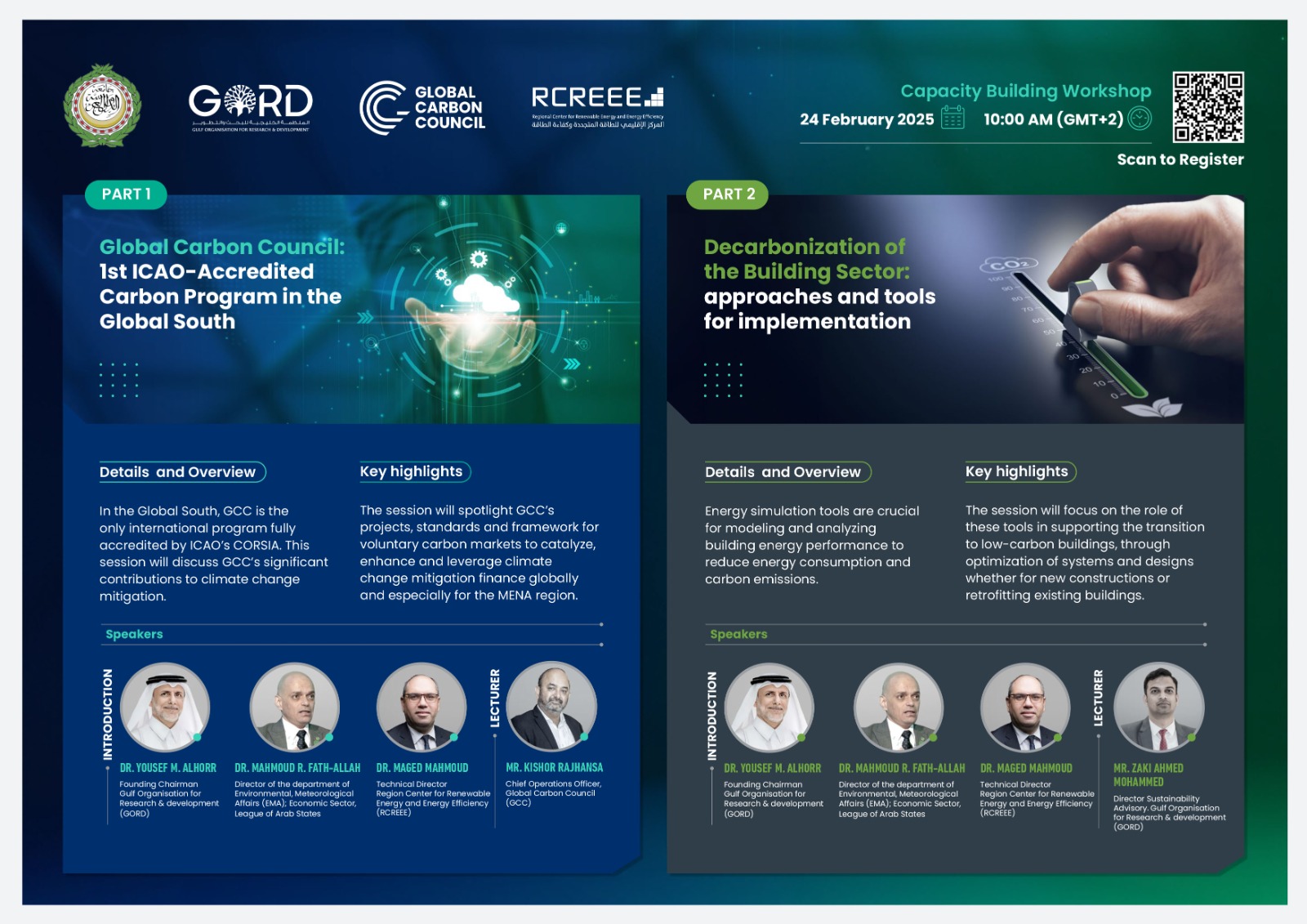 ​The Arab world has the potential to become a leader in sustainable energy! the Gulf Organisation for Research and Development (GORD), Global Carbon Council (GCC), the League of Arab States, and the Regional Center for Renewable Energy and Energy Efficiency (RCREEE) are joining forces to host a comprehensive workshop exploring pathways for climate mitigation through the energy transition.